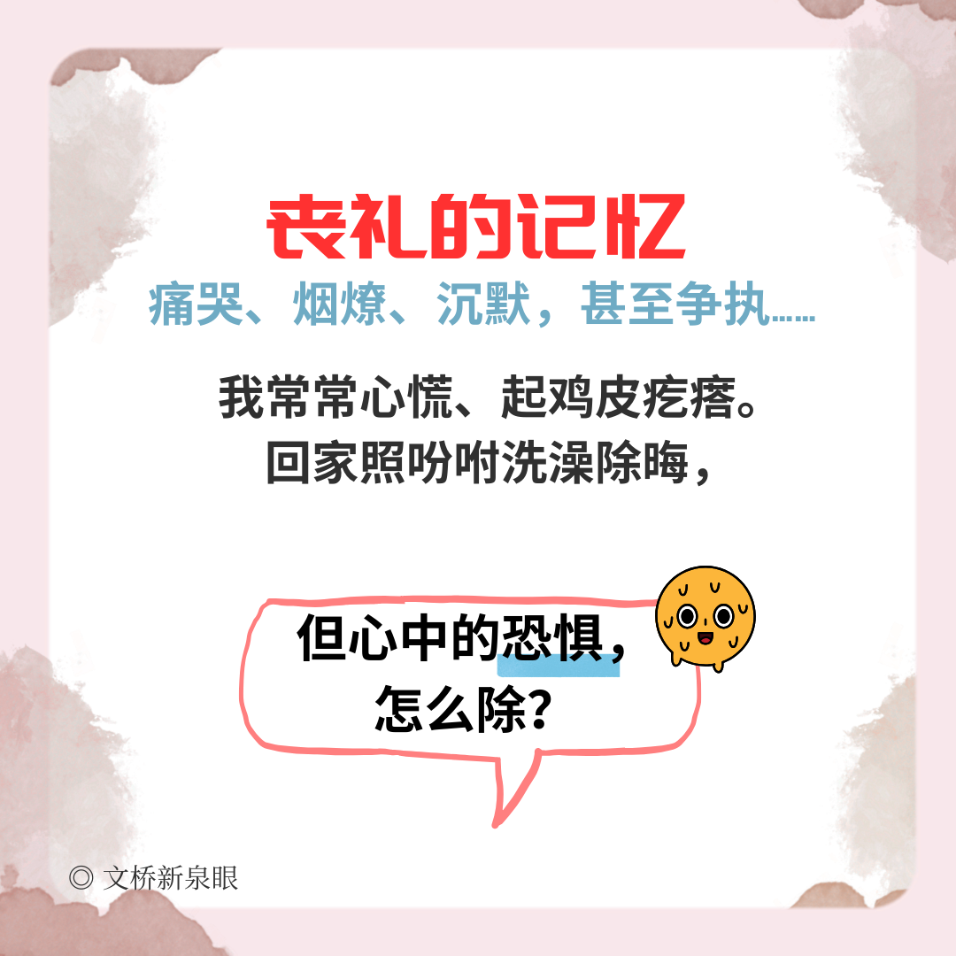 丧礼的印象,就跟TVB相关剧情相似。许多哭啼、敲击、刺眼的烟燎,甚至在后来参加过的丧礼,还上演亲属争闹不和。而我总在踏入场地时,不自觉、无法控制起鸡皮疙瘩,有种心慌的感觉。我不知道自己害怕什么,回家后遵从长辈吩咐洗澡除晦,但心中的阴郁,又如何扫除?