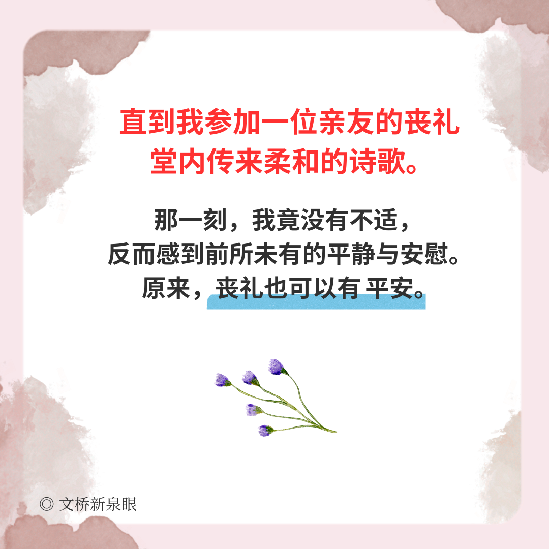 基督徒不但不害怕丧礼,不害怕“沾染晦气”,不害怕“死人”,更不害怕“死亡”;不但如此,他们视“出席丧礼”为更重要的事,是喜乐地回溯逝者的生命、数算恩典,是见证并传扬主耶稣复活的生命和盼望;最后,他们不忘把这祝福分享给人——所有相信祂的人,就一定得到这“真正平安”。