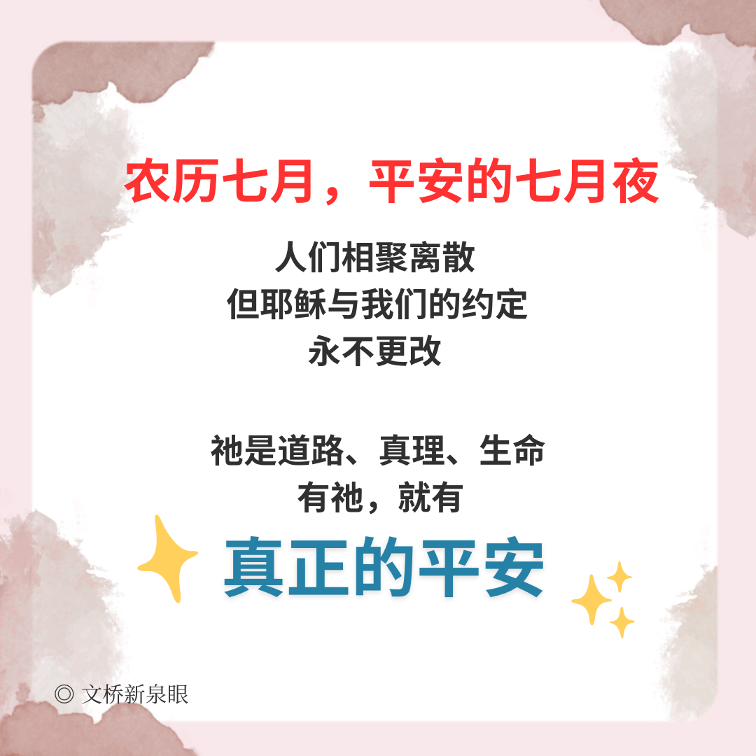 农历七月,平安的七月夜。人们相聚离散,但耶稣与我们的约定却永不更改,因为祂是生命源头、终点与延续的答案!