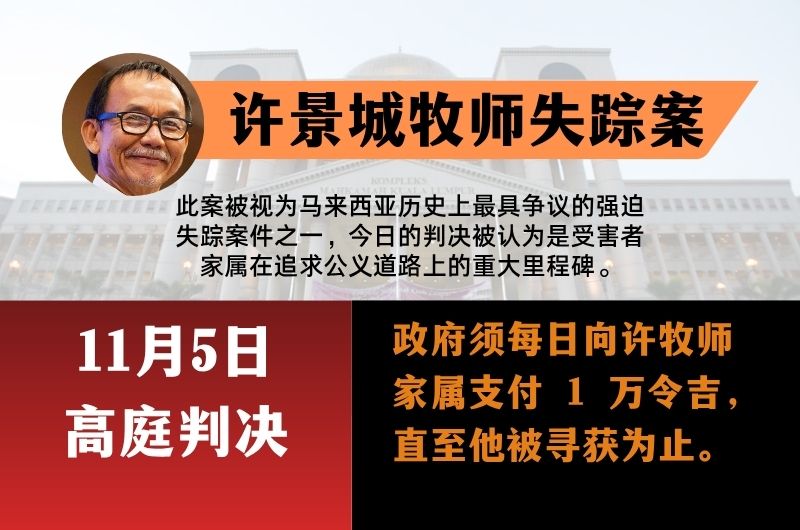【许景城牧师失踪案】11月5日高庭判决 :政府须每日向许牧师家属支付 1 万令吉,直至他被寻获为止