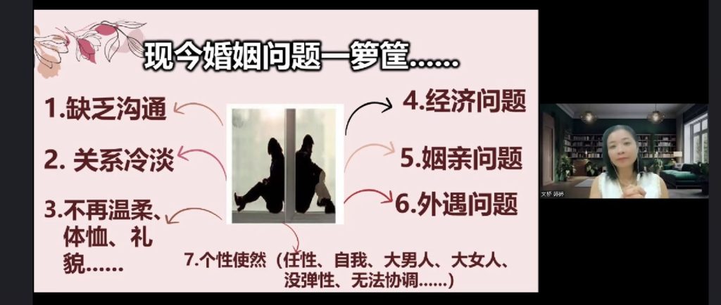 课程内容之一:婚姻问题剖析。讲员:梁婷婷(注册与执证心理辅导师)