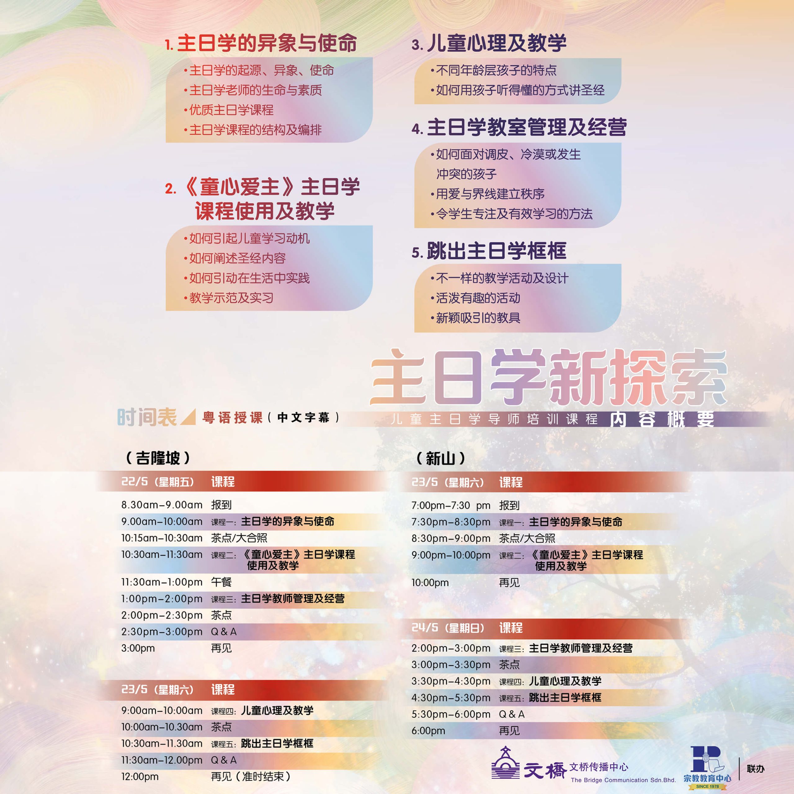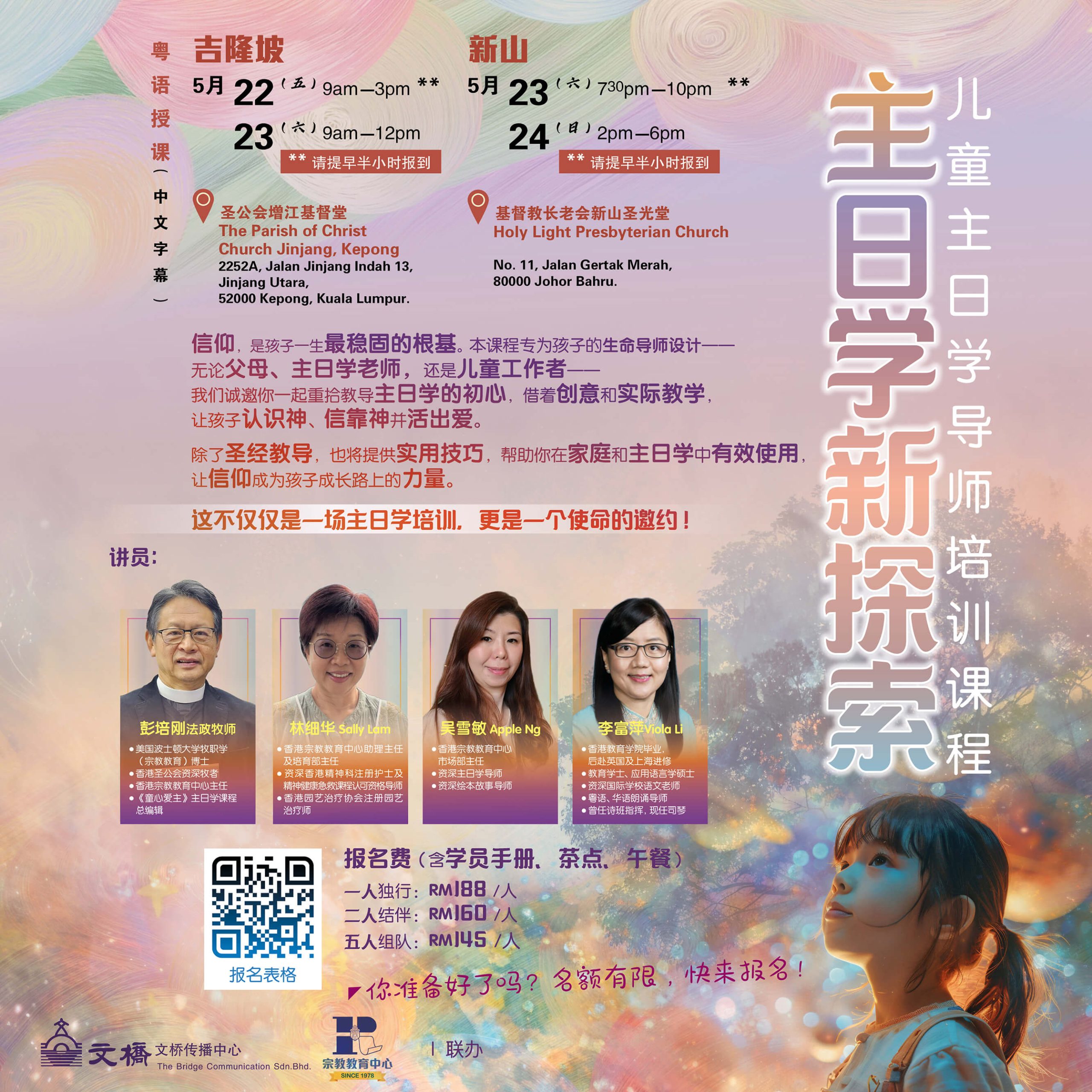本课程专为孩子的生命导师设计——无论父母、主日学老师,还是儿童工作者——我们诚邀你一起重拾教导主日学的初心,借着创意和实际教学,让孩子认识神、信靠神并活出爱。